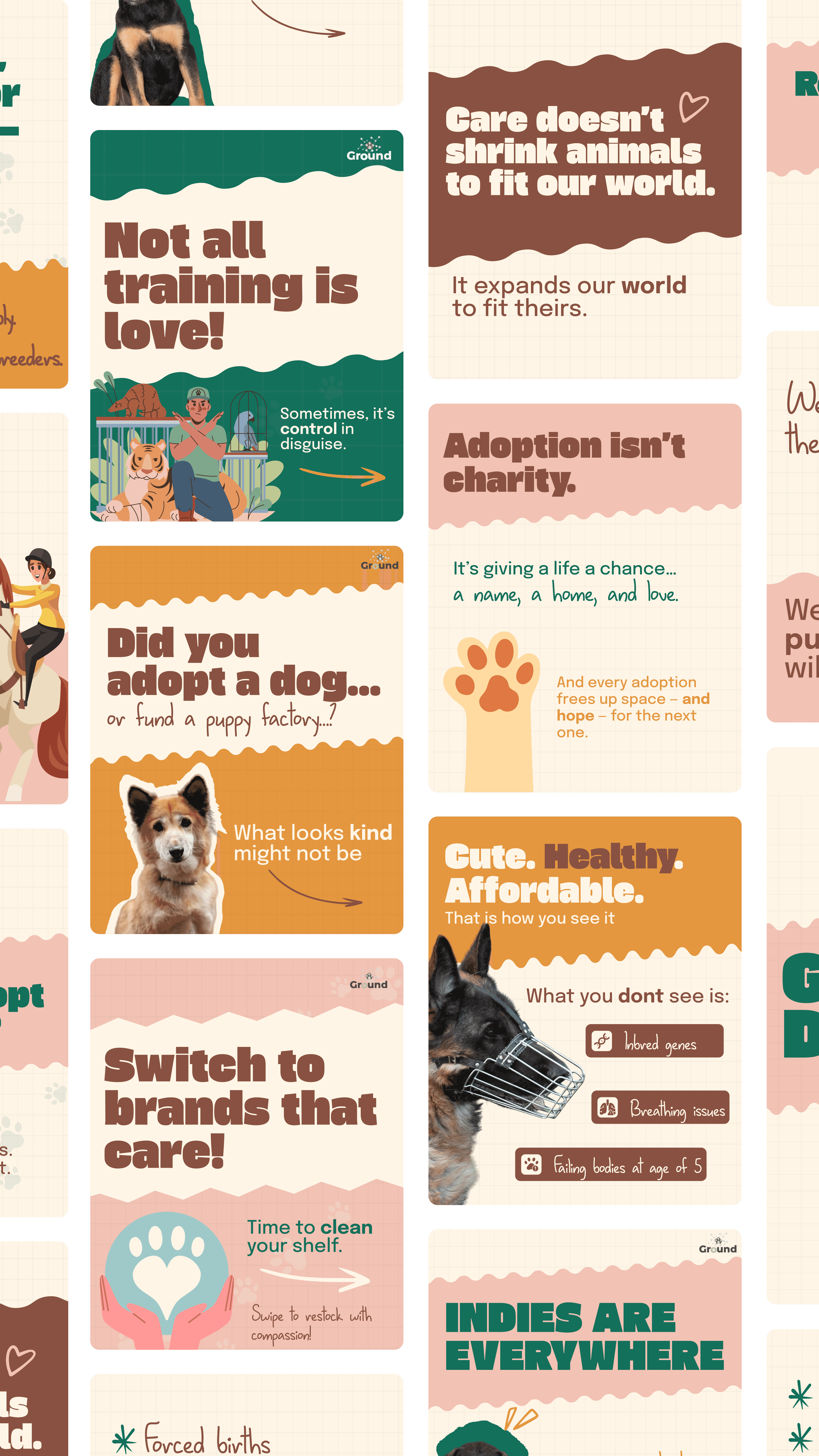 Ground Animal Welfare is a non-profit organization dedicated to rescuing, rehabilitating, and protecting animals in need. While their on-ground impact was strong, their digital presence didn’t fully reflect the scale of their work or make it easy for people to understand, support, or engage with the cause. The goal of this project was to redesign the social media and website to clearly communicate the organization’s mission, simplify information access, and encourage meaningful actions such as donations, volunteering, and adoption.