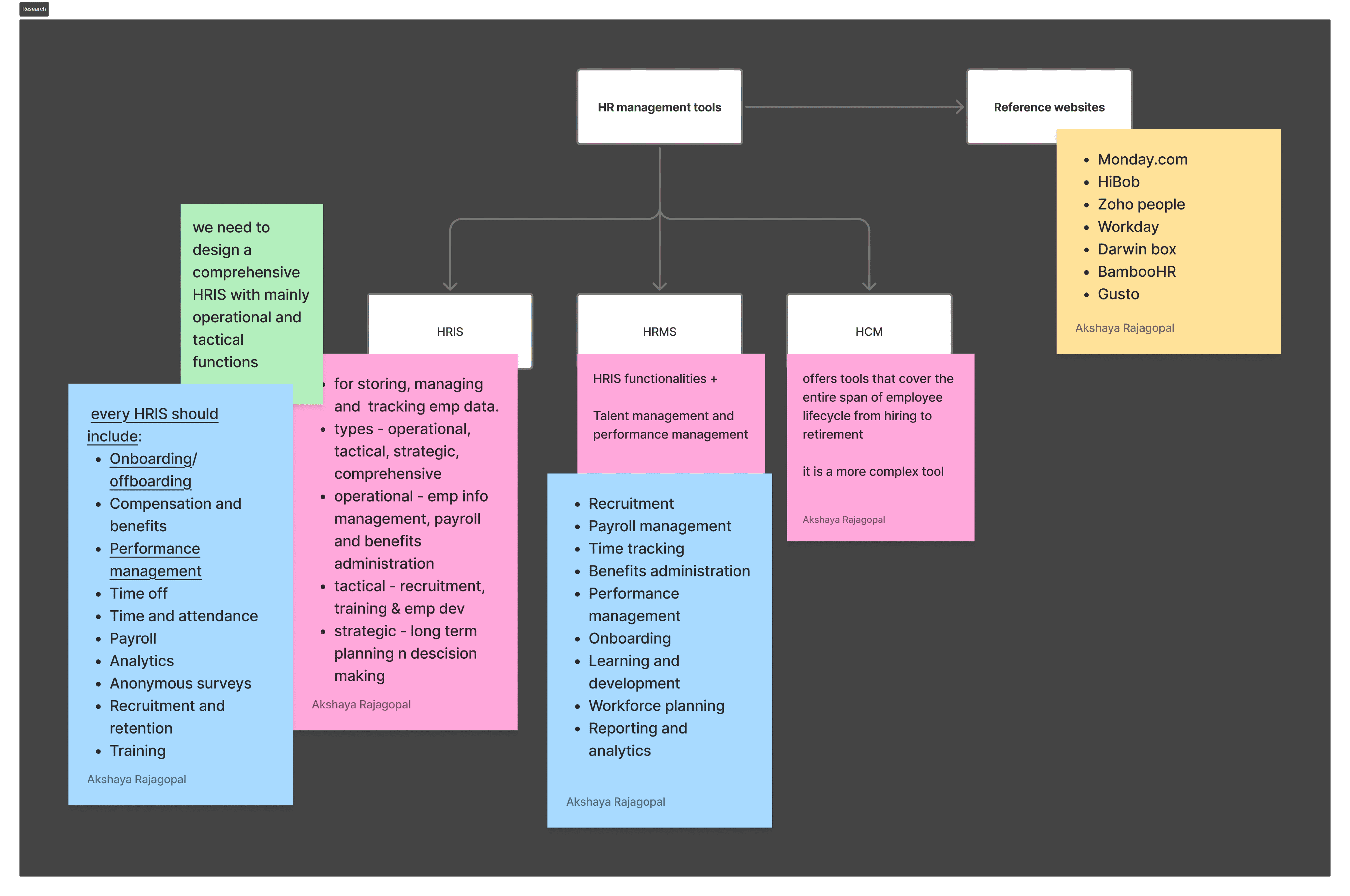 To ground the platform in real operational needs, I began with qualitative research and stakeholder conversations across multiple roles within the organization. This included HR professionals responsible for policy enforcement and documentation, directors and BU heads who would use the system for performance reviews and calibration, and employees who needed a simple way to set goals, track progress, and raise HR queries. These conversations helped surface gaps in existing tools, pain points in current workflows, and differences in expectations across user groups.