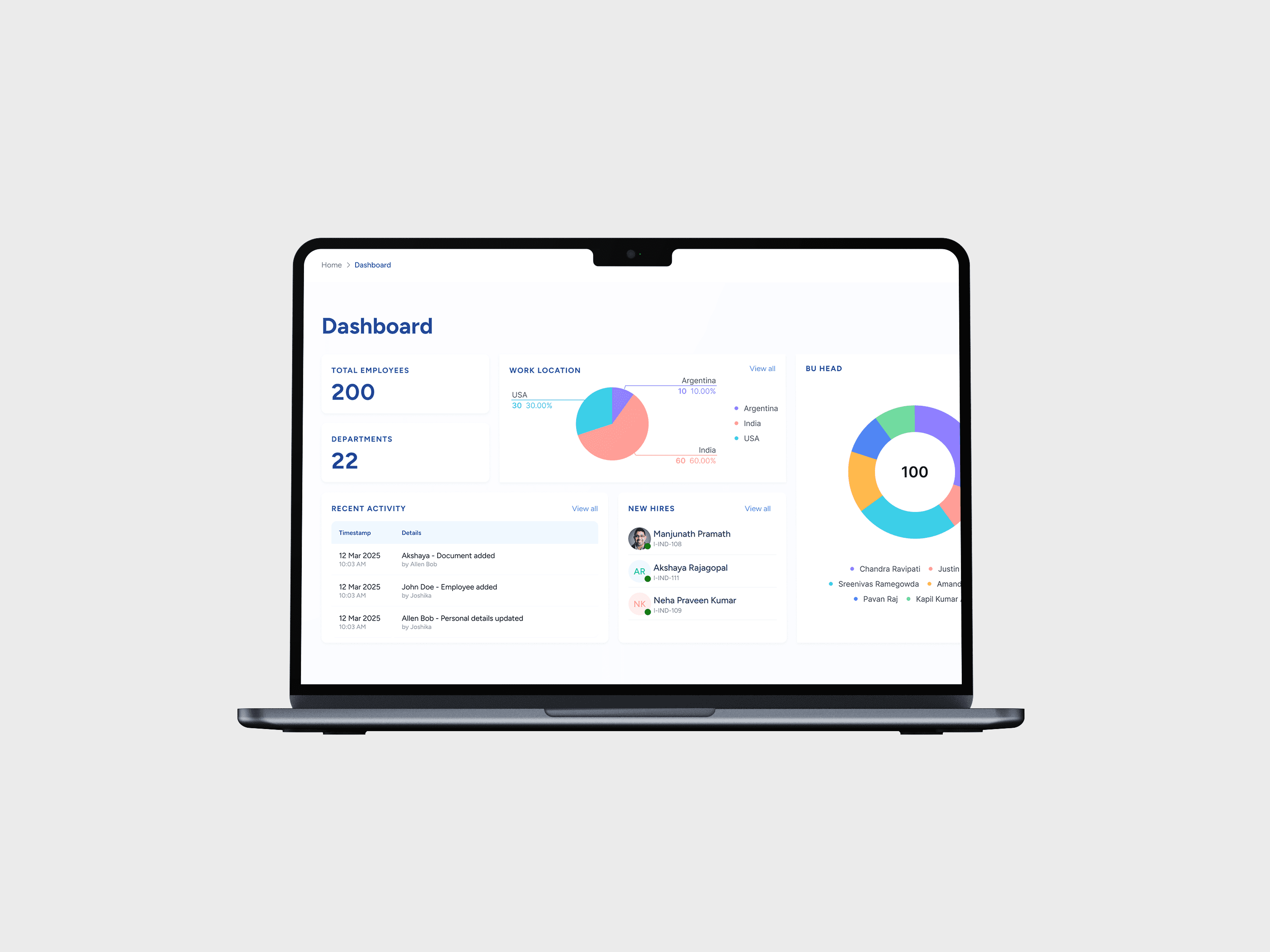 HR workflows are inherently complex and often distributed across multiple systems. Key challenges included: 1. Fragmented tools for onboarding, performance, and documentation 2. High administrative overhead for HR teams 3. Inconsistent employee experiences across different HR touchpoints 4. The need to support multiple user roles with different permissions and goals The platform needed to simplify these processes without oversimplifying the underlying business logic.